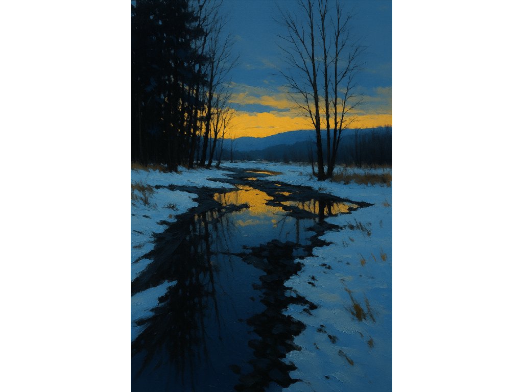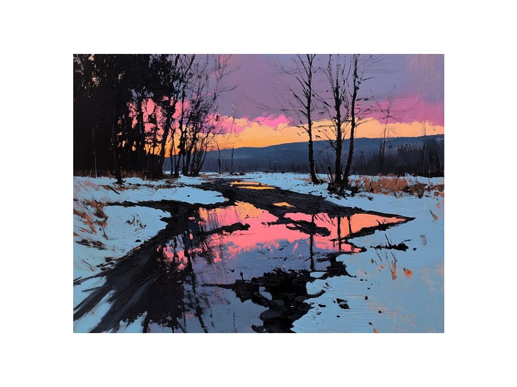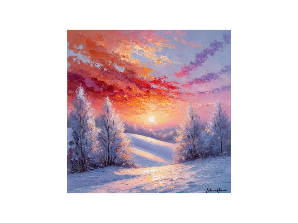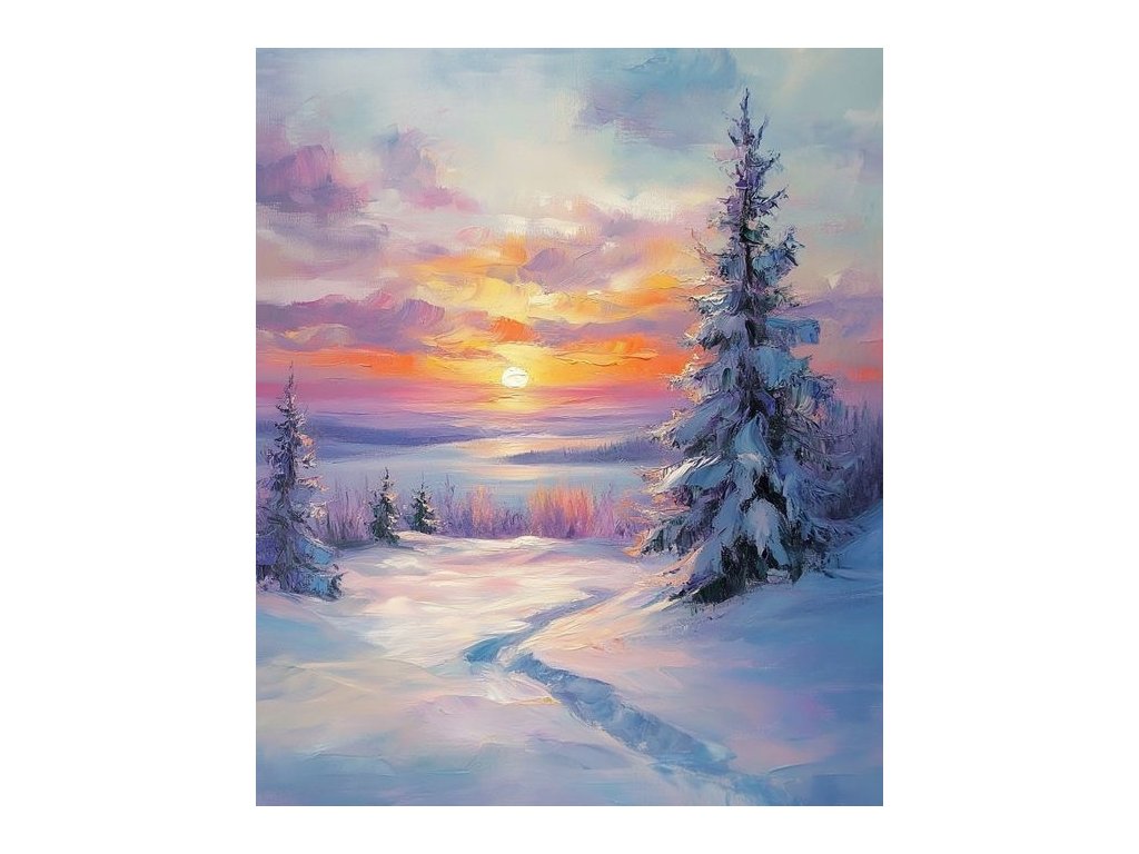 Ticho zimního rána ožívá prvními paprsky slunce nad zasněženou krajinou. Obraz zachytí jemné světlo, chladné tóny a klidnou atmosféru nového dne.